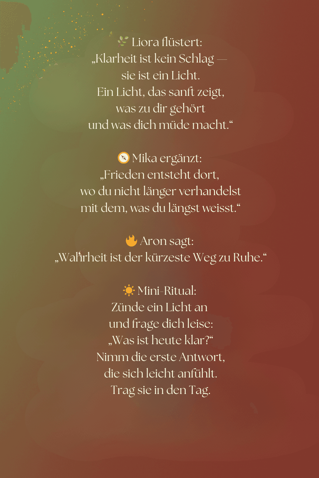 © Rahel Sahler – alle Texte und Inhalte urheberrechtlich geschützt. Liora, Mika und Aron sind sinnbildliche Figuren, die meine inneren weiblichen und männlichen Anteile repräsentieren. Ihre Darstellung dient der symbolischen Orientierung und ersetzt keine medizinische, therapeutische oder psychologische Behandlung.