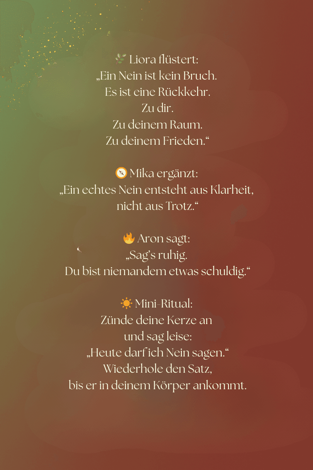 © Rahel Sahler – alle Texte und Inhalte urheberrechtlich geschützt. Liora, Mika und Aron sind sinnbildliche Figuren, die meine inneren weiblichen und männlichen Anteile repräsentieren. Ihre Darstellung dient der symbolischen Orientierung und ersetzt keine medizinische, therapeutische oder psychologische Behandlung.