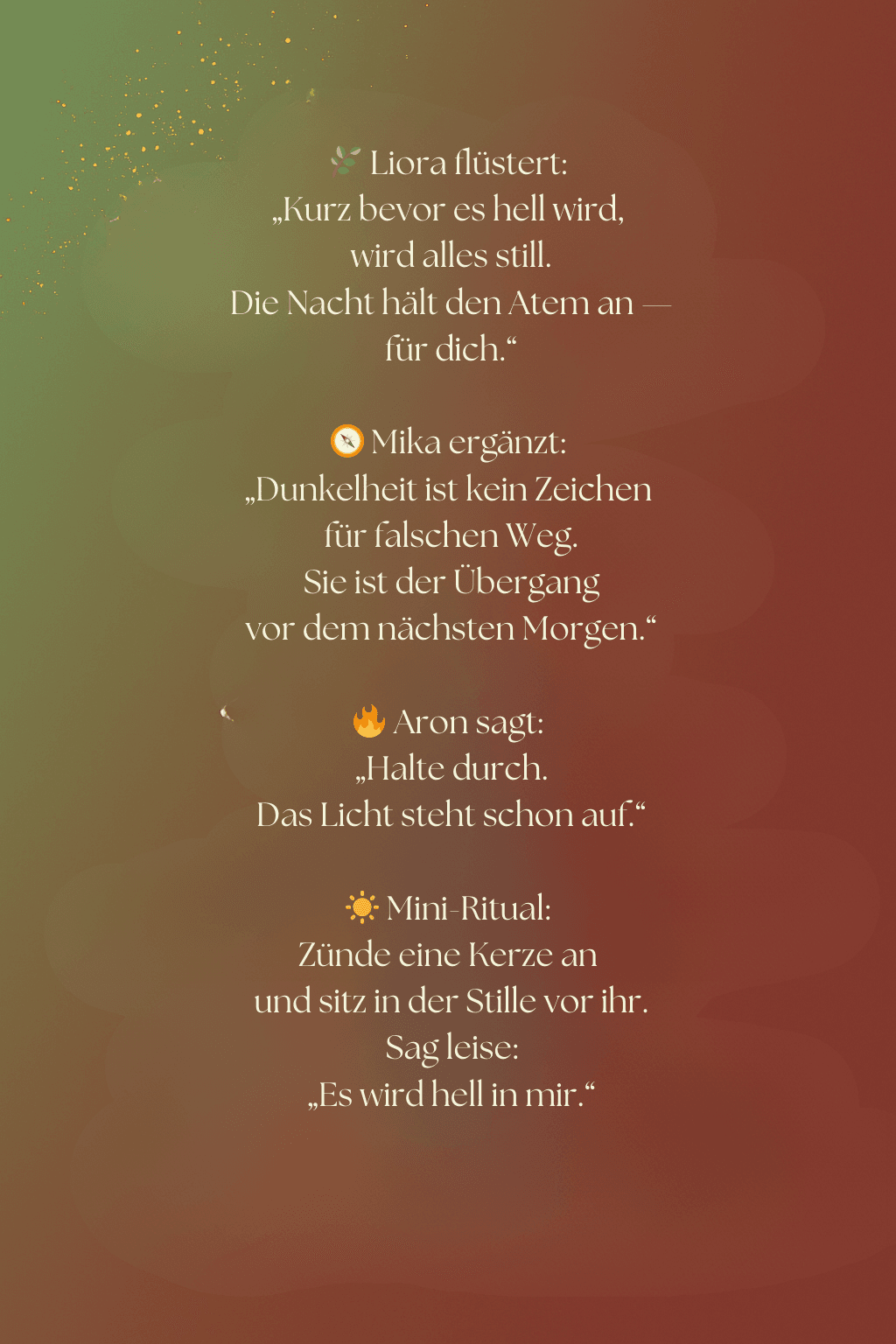 Flamme 20 – Liebe in Bewegung20. Dezember 2025Flamme 22 – Das innere Zuhause22. Dezember 2025 Veröffentlicht von Rahel Sahler Kategorien Adventskalender 2025 Tags Teilen0ähnliche BeiträgeFlamme 24 – Du bist das WeihnachtslichtWeiterlesenFlamme 23 – Dankbarkeit als BrückeWeiterlesenFlamme 22 – Das innere ZuhauseWeiterlesenFlamme 20 – Liebe in BewegungWeiterlesenFlamme 19 – Wenn du loslässtWeiterlesen
