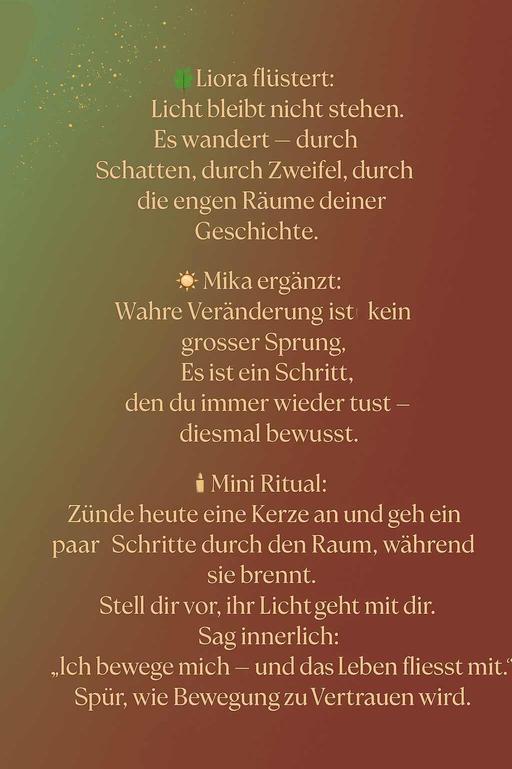 Flamme 4 – Der Raum zwischen den Atemzügen4. Dezember 2025Flamme 6 – Ein Licht für das Kind in dir6. Dezember 2025 Veröffentlicht von Rahel Sahler Kategorien Adventskalender 2025 Tags Teilen0ähnliche BeiträgeFlamme 24 – Du bist das WeihnachtslichtWeiterlesenFlamme 23 – Dankbarkeit als BrückeWeiterlesenFlamme 22 – Das innere ZuhauseWeiterlesenFlamme 21 – Die Nacht vor dem LichtWeiterlesenFlamme 20 – Liebe in BewegungWeiterlesen